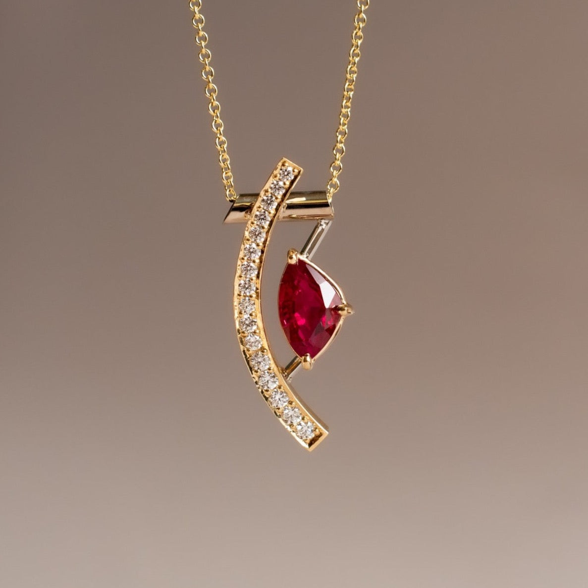 At the heart of this pendant lies a stunning Burmese Ruby, renowned for its vibrant red hue and unrivaled allure. The color of Burmese rubies is their defining feature, exhibiting a vibrant, deep red hue that is often described as "Pigeon's Blood" red, the most sought-after and prized color for a ruby.