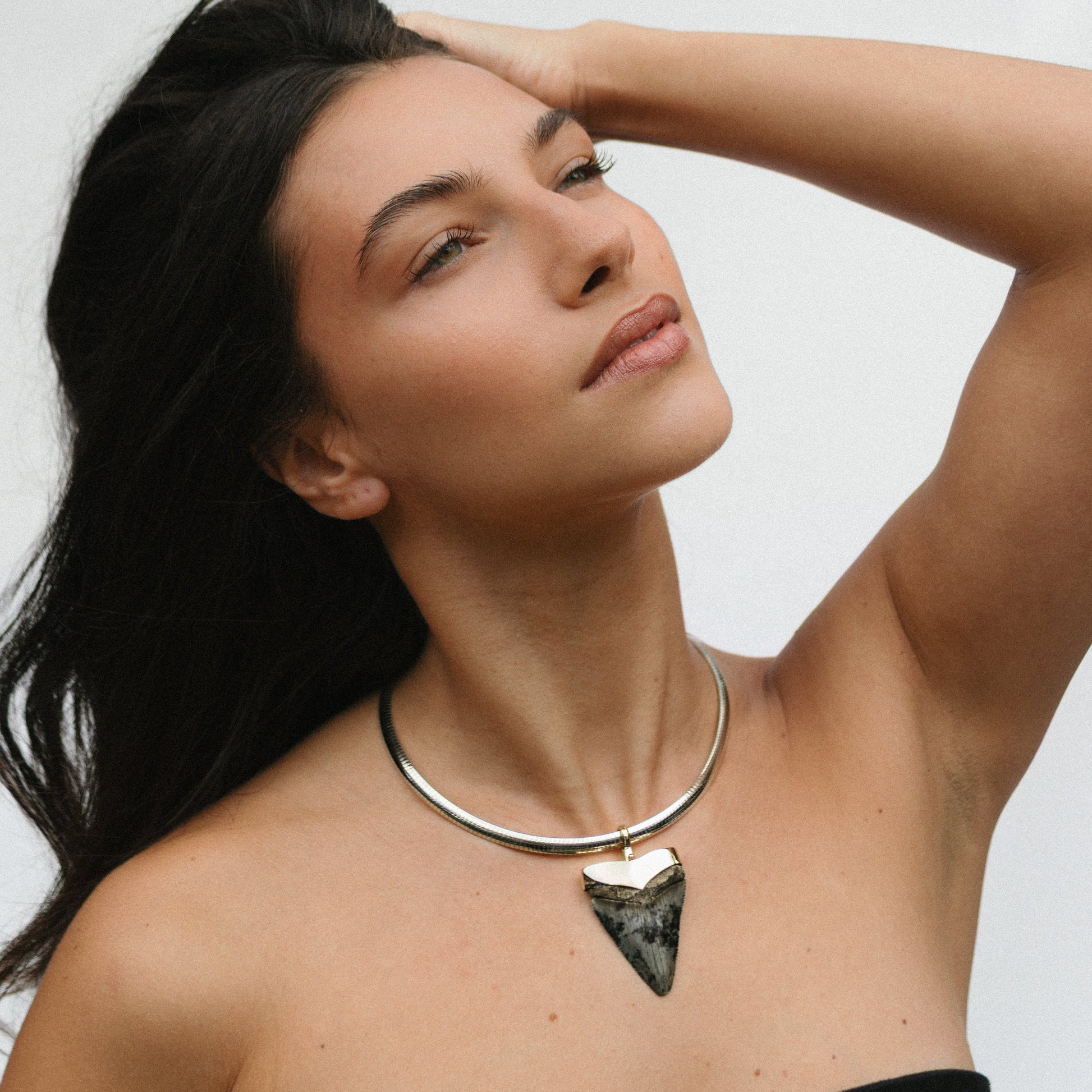 This 14k yellow gold cap is formed to securely hold the tooth, creating a clean, modern mounting for a coastal treasure.