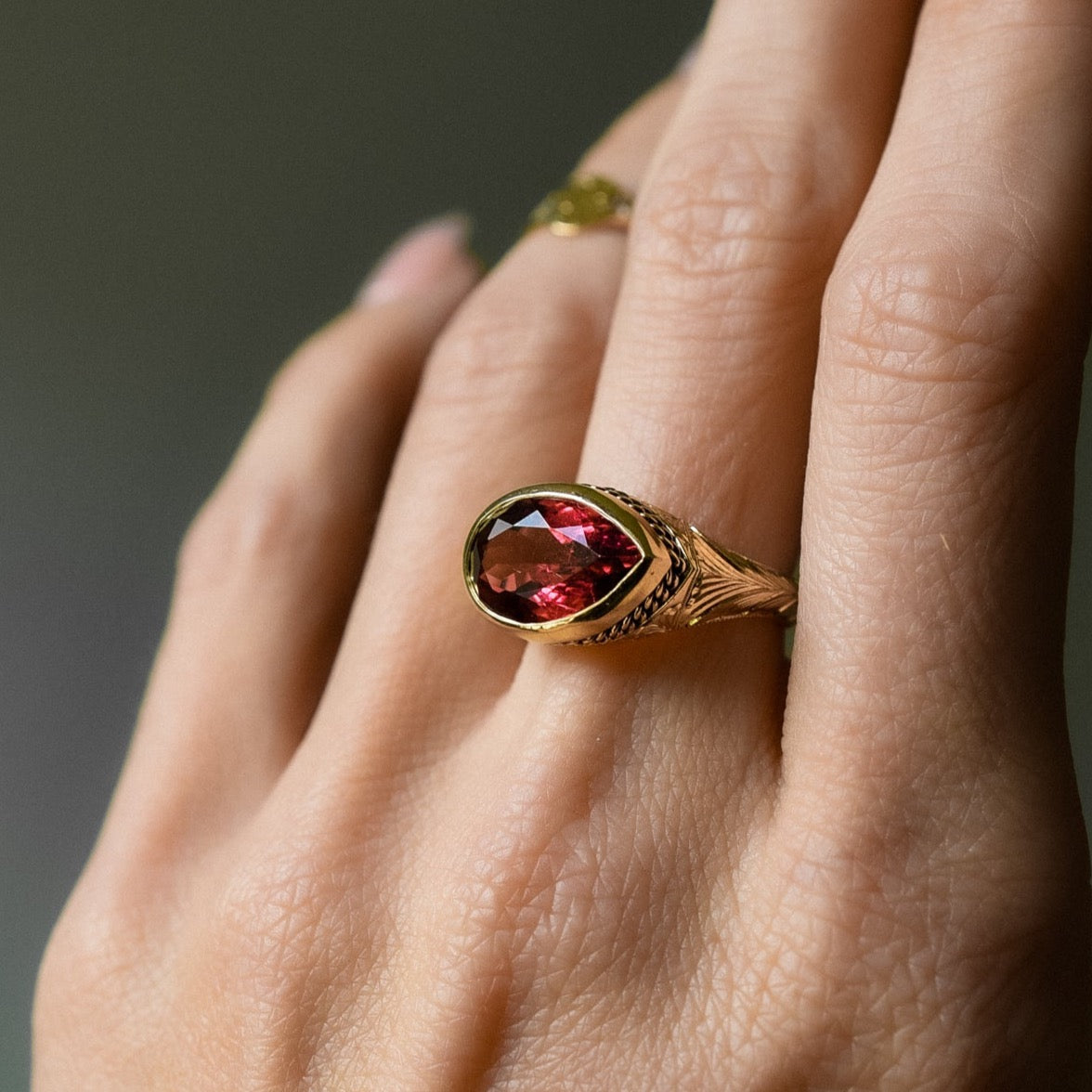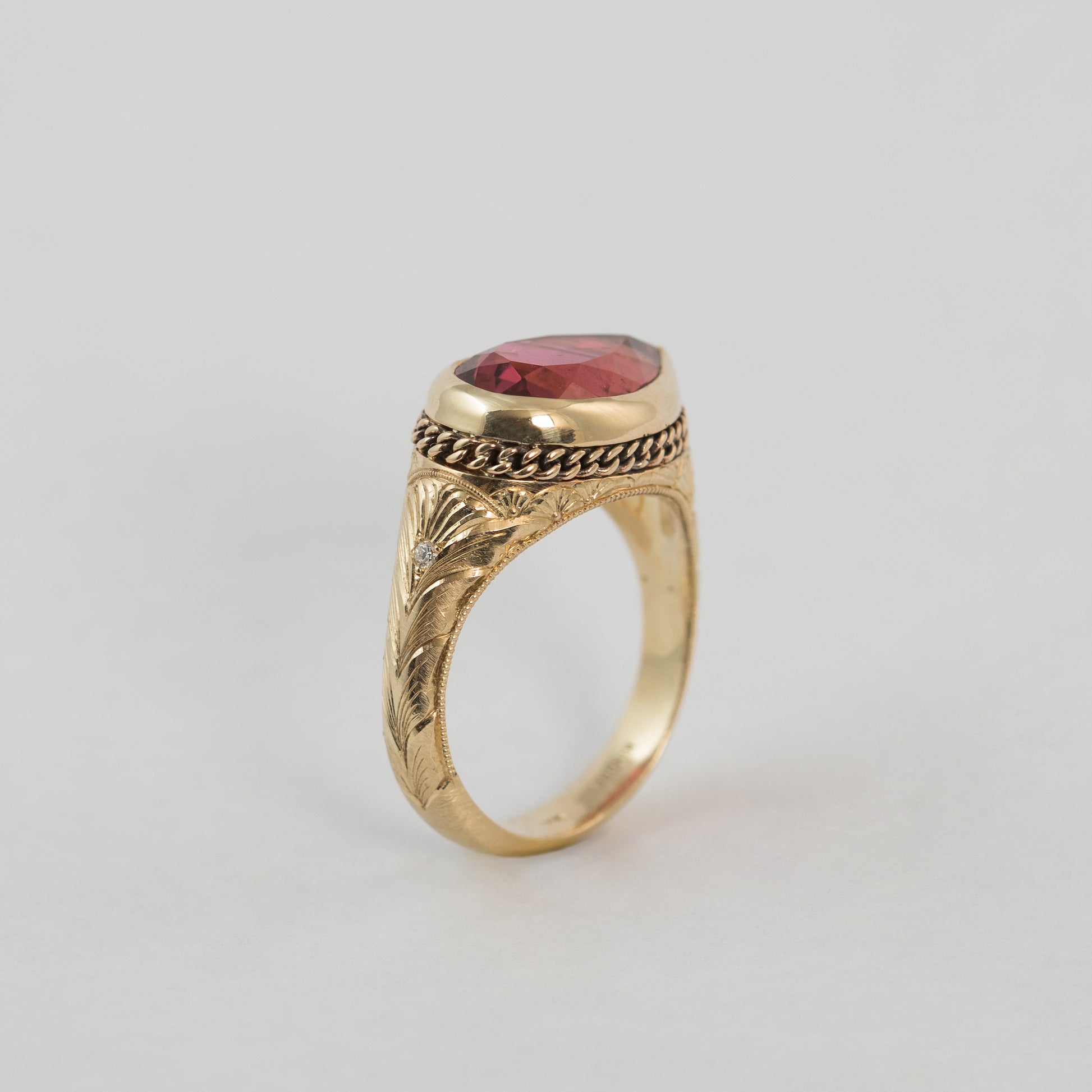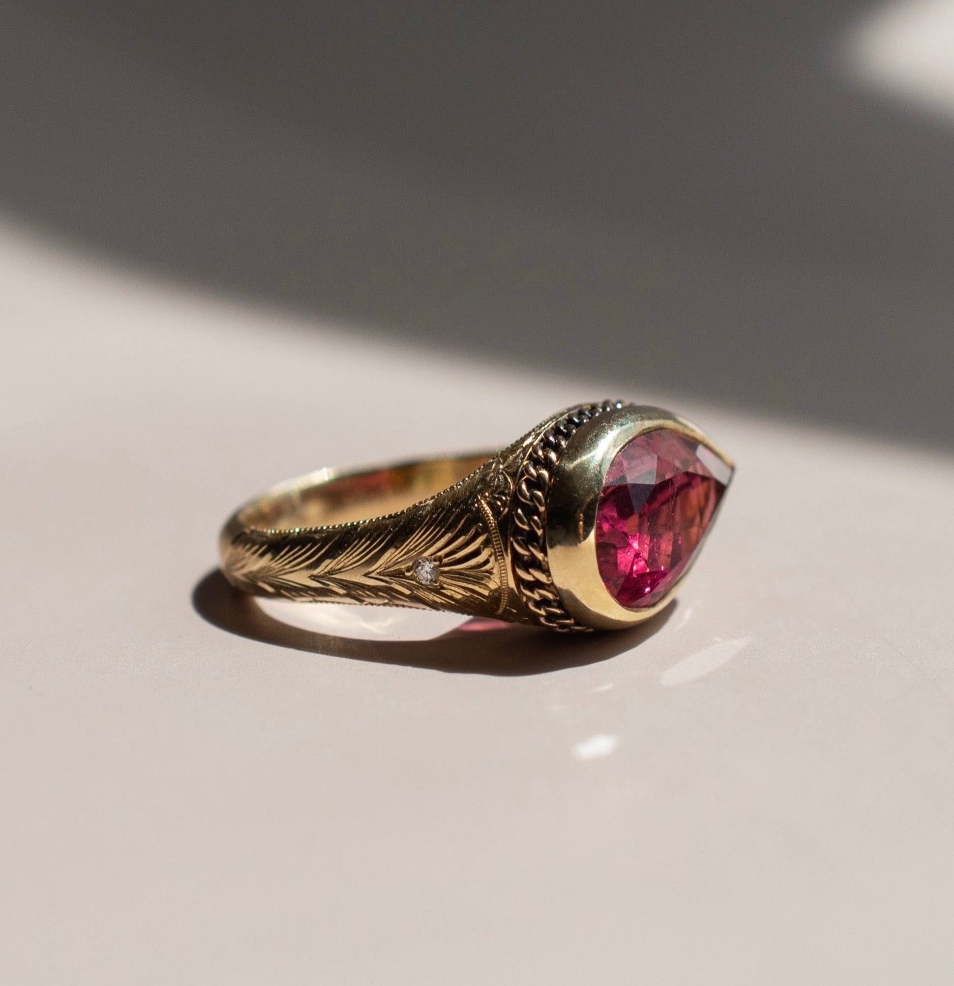 Materials - 14k Yellow Gold, 3.85 carat Rubellite tourmaline, natural diamond accent of 0.01 carats
