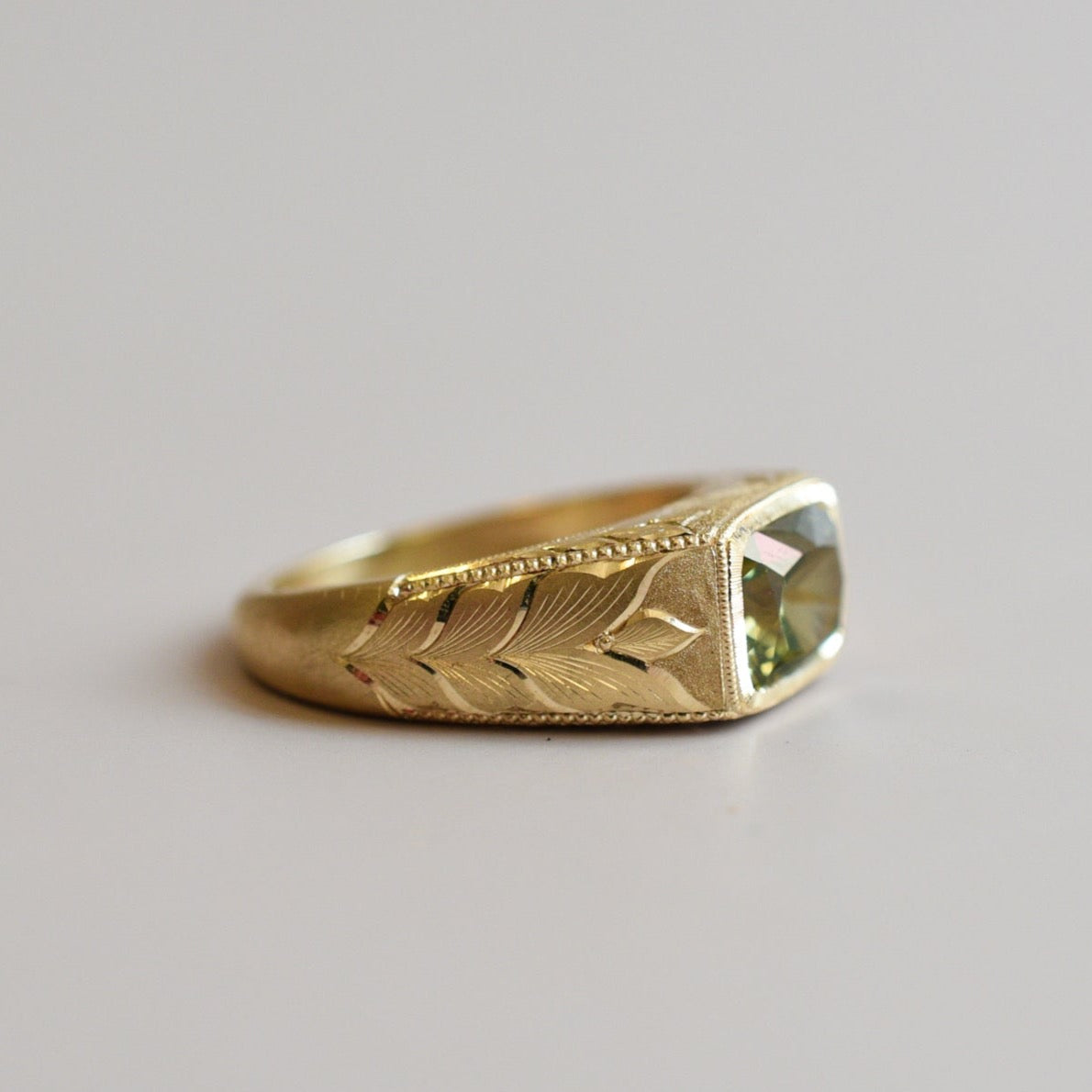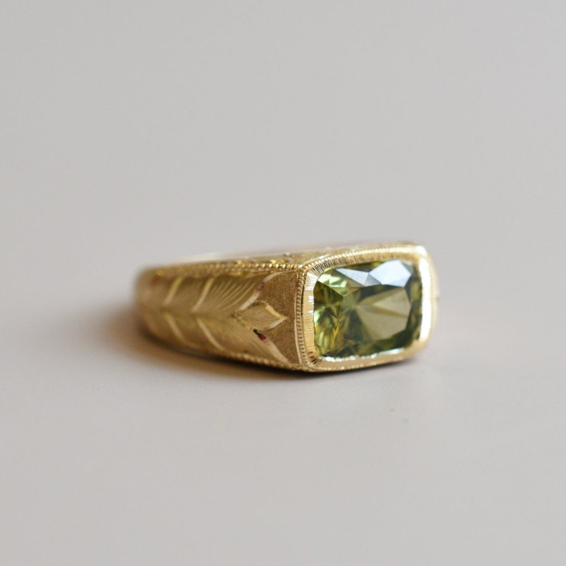 2.94ct Green Zircon set in 14k yellow gold carved from wax by Kindred, casted by Jay, stone setting and hand engraving by Kindred.