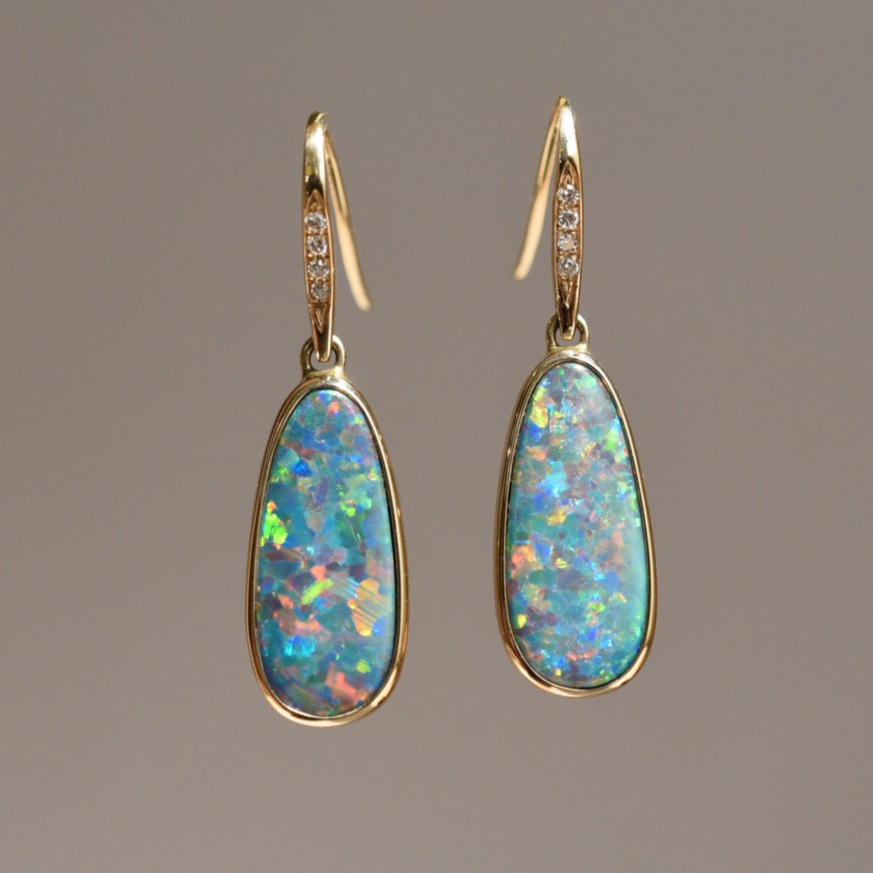 Two richly saturated opals bezel set in yellow gold hang gracefully from the ear. Just dying to frame your perfect face.