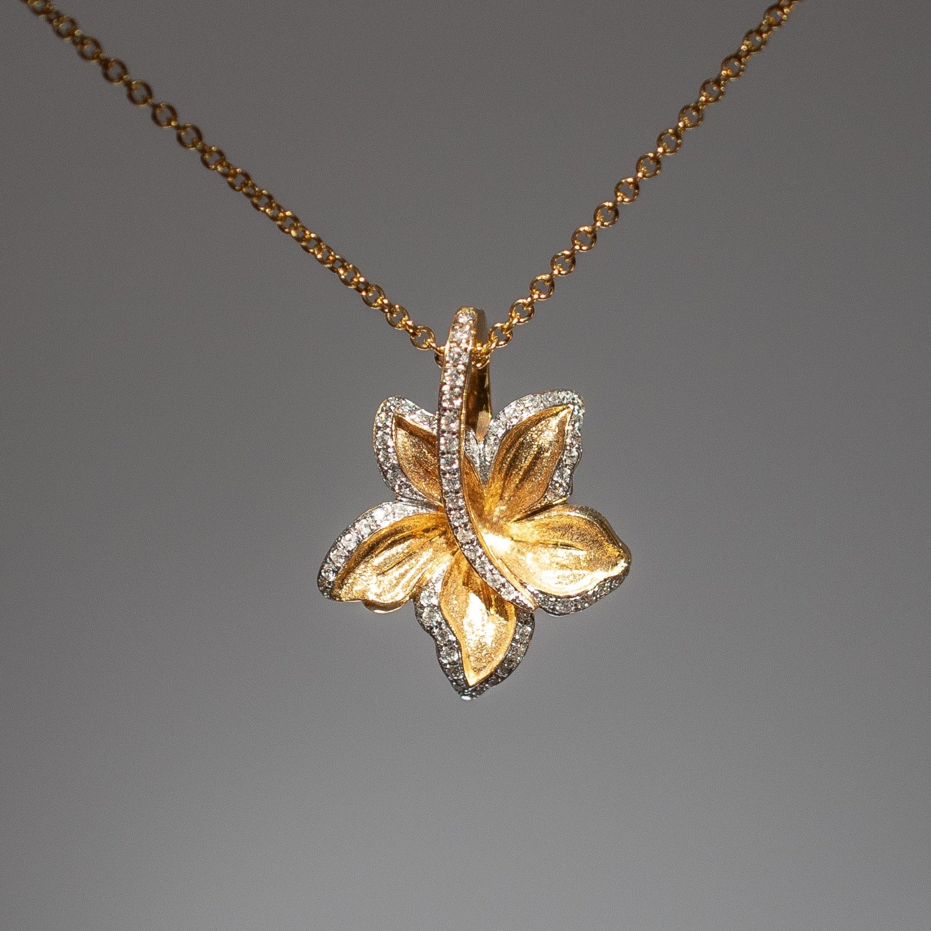 A soft, matte finished plumeria flower punctuated by diamonds.