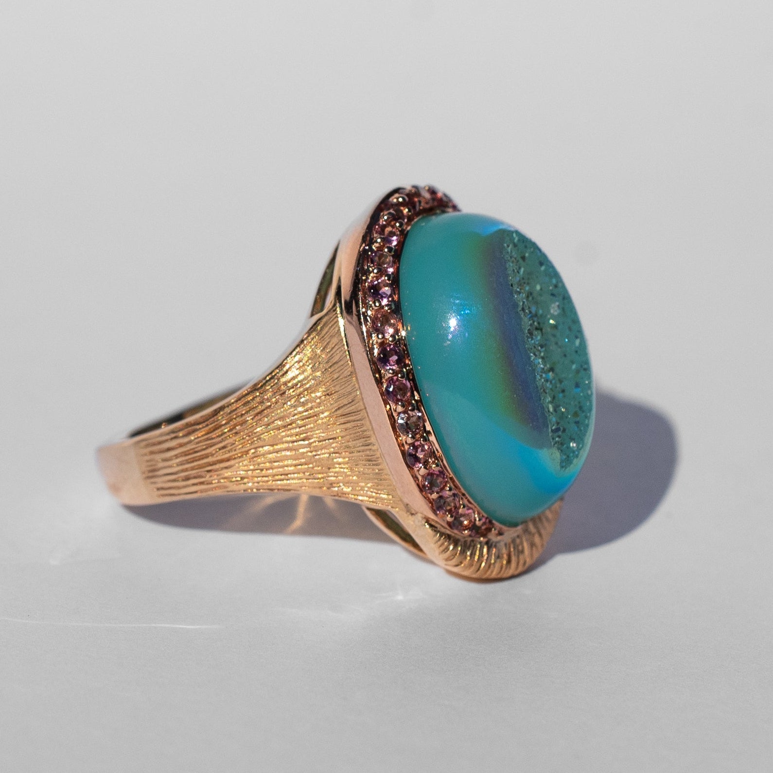 Impossible to ignore, this Druzy Quartz Ring shimmers with natural crystal texture whilst accented by pink tourmalines.
